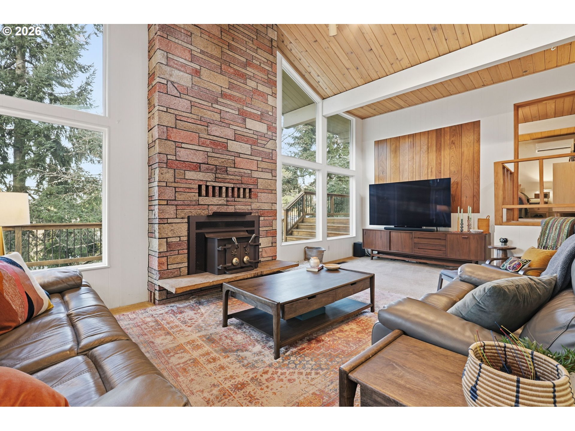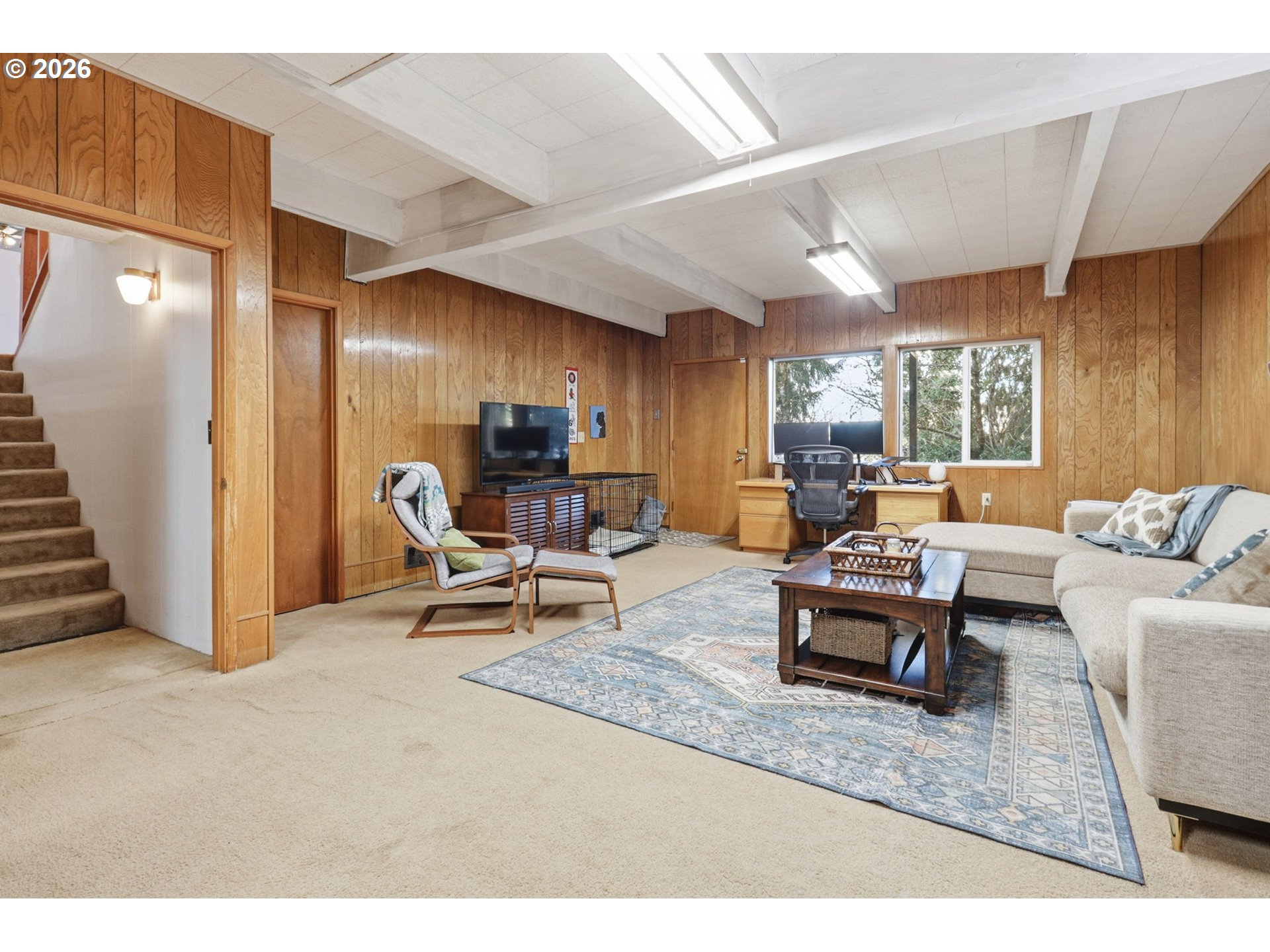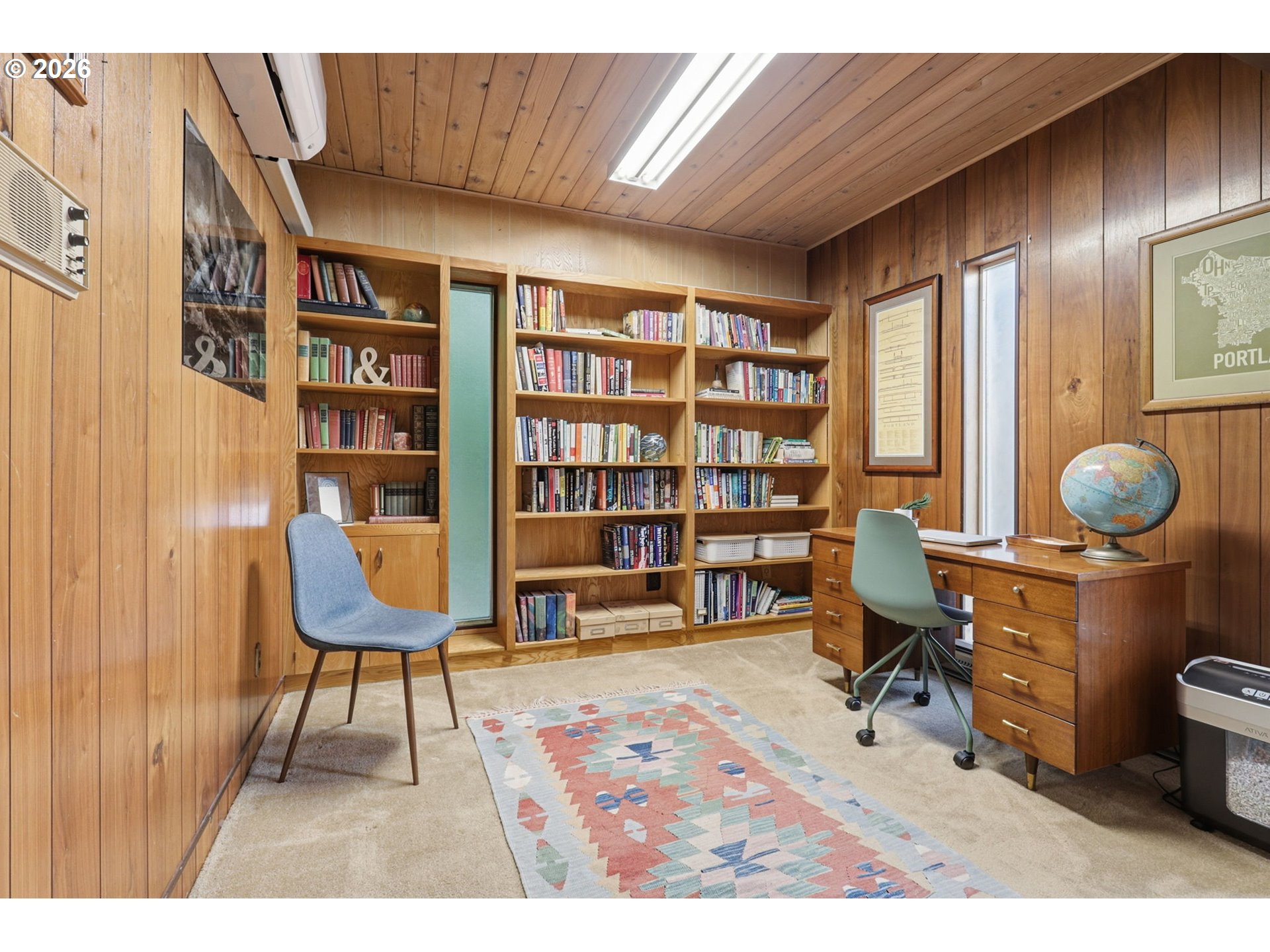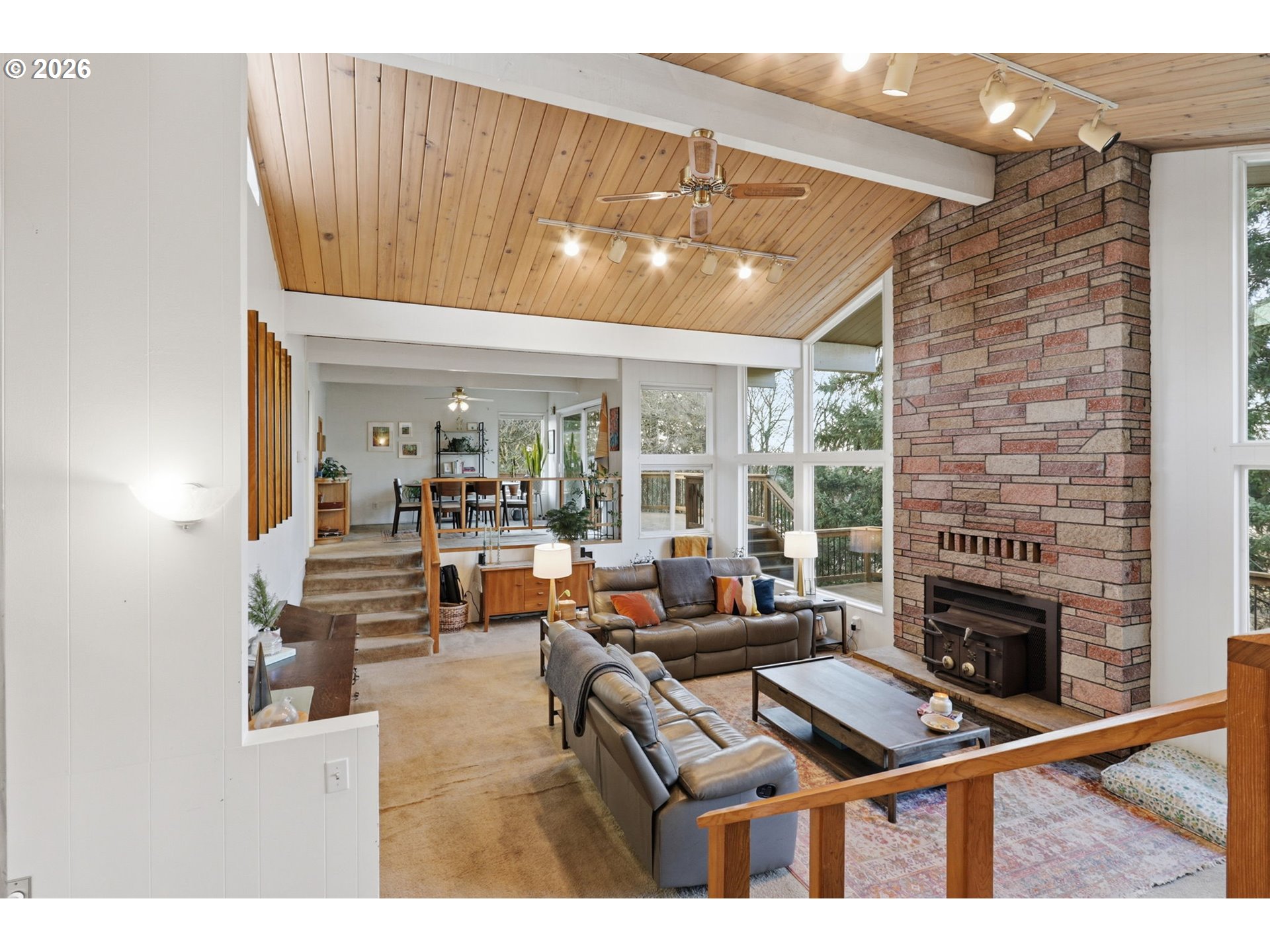 (503) 336-1515Gorgeous Mid-Century Modern with iconic architectural lines and timeless design, this 4 bedroom, 2.1 bath home features soaring vaulted ceilings with dramatic beams, striking angles, warm wood character, and a wall of windows that floods the interiors with natural light. A statement fireplace anchors the main living space, while built-in shelving adds both function and style, including a main-level office with rich wood paneling and custom built-ins that feels like a private library or den. The flexible layout includes a daylight basement with a separate entrance, offering exceptional potential for a second living area, guest suite, multigenerational living, creative studio, or private work-from-home space, plus a “secret” tucked-away second office downstairs for quiet focus. A standout opportunity to make a one-of-a-kind architectural home your own.