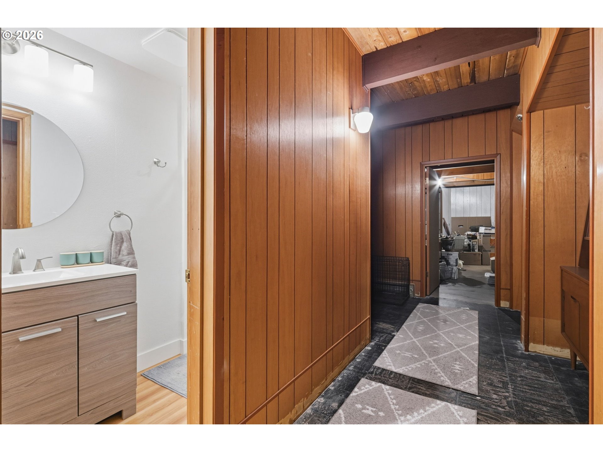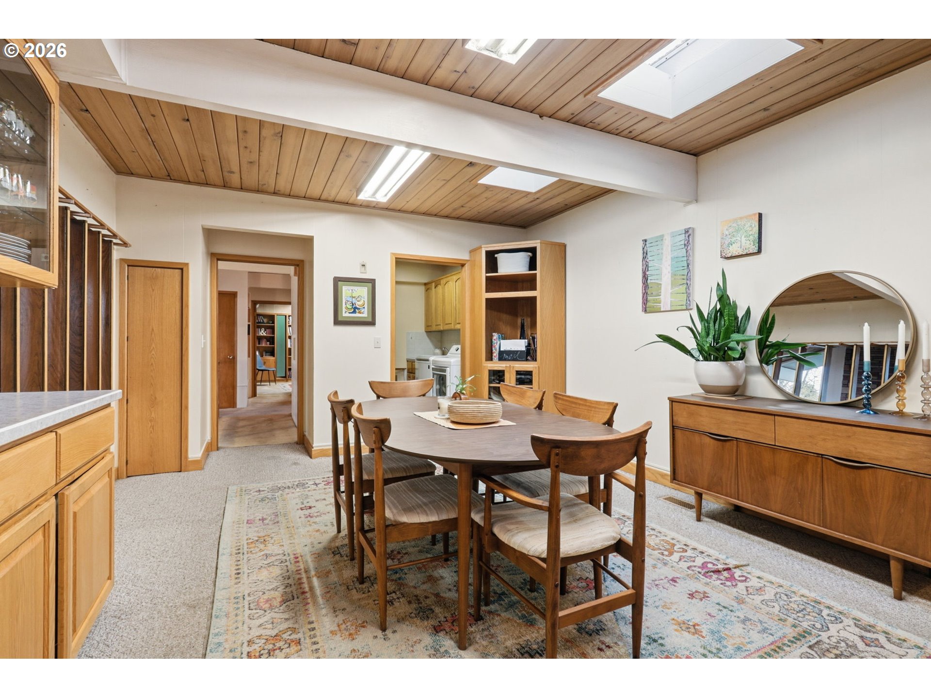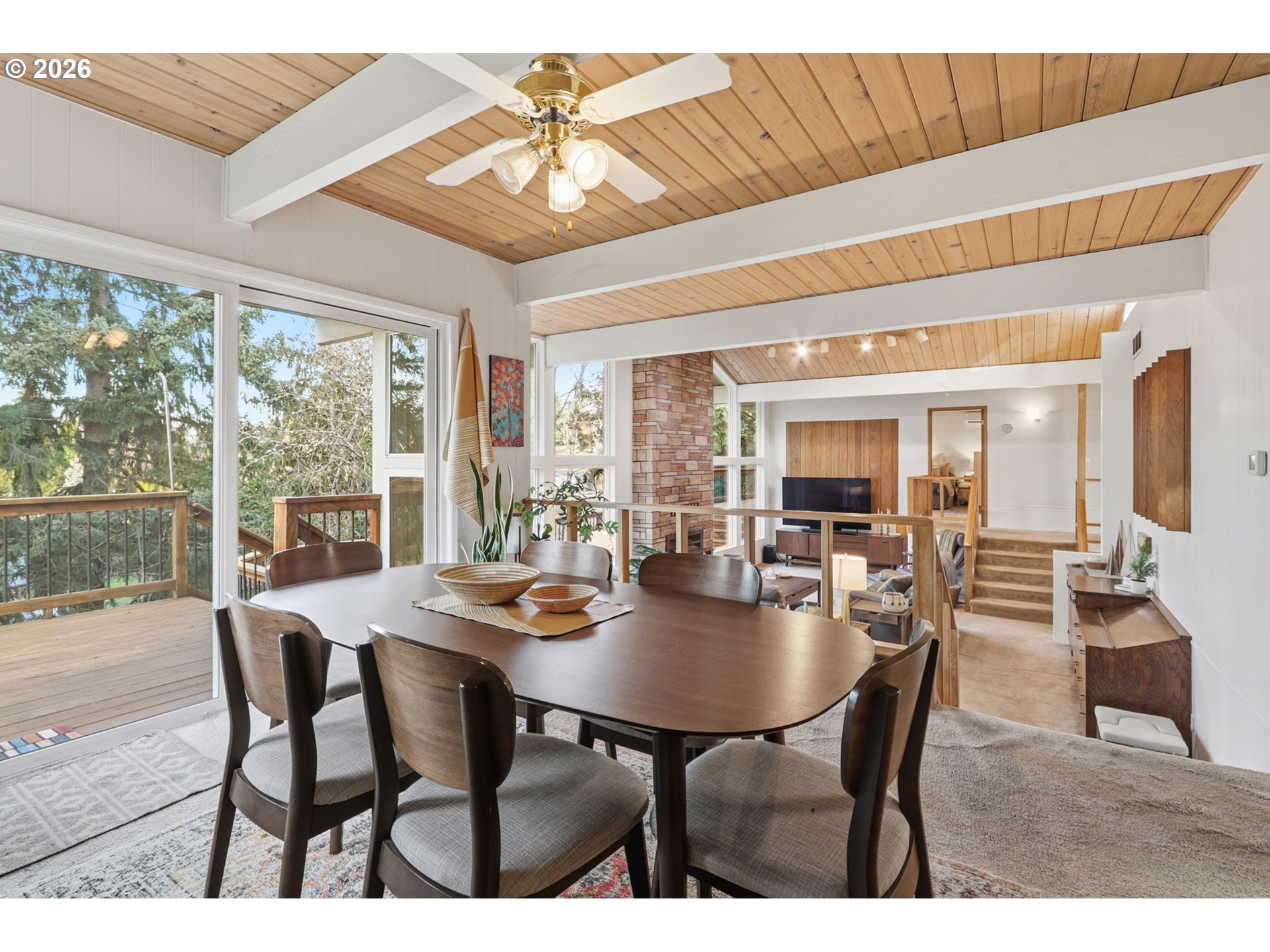 (503) 336-1515Gorgeous Mid-Century Modern with iconic architectural lines and timeless design, this 4 bedroom, 2.1 bath home features soaring vaulted ceilings with dramatic beams, striking angles, warm wood character, and a wall of windows that floods the interiors with natural light. A statement fireplace anchors the main living space, while built-in shelving adds both function and style, including a main-level office with rich wood paneling and custom built-ins that feels like a private library or den. The flexible layout includes a daylight basement with a separate entrance, offering exceptional potential for a second living area, guest suite, multigenerational living, creative studio, or private work-from-home space, plus a “secret” tucked-away second office downstairs for quiet focus. A standout opportunity to make a one-of-a-kind architectural home your own.