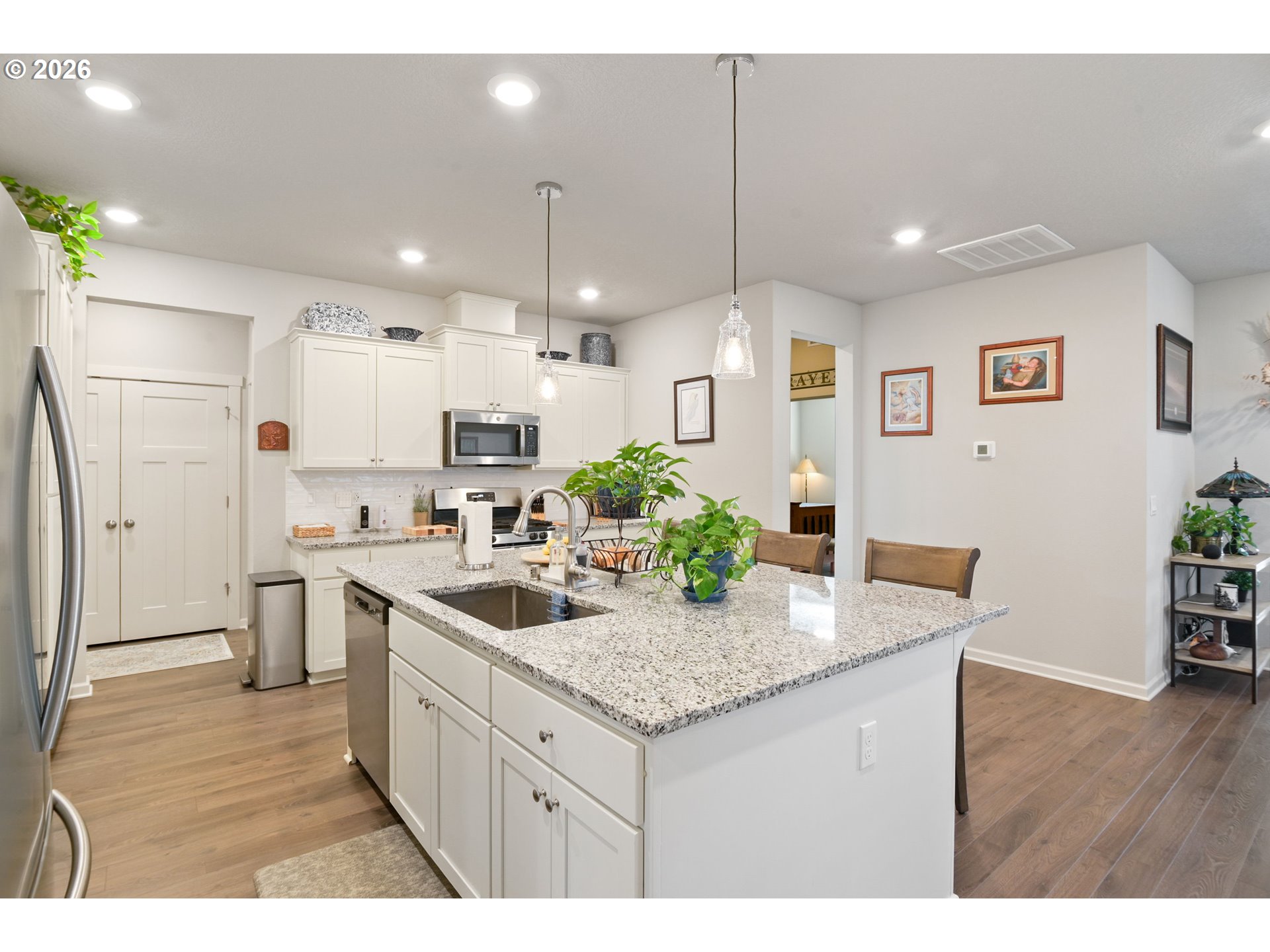 (503) 336-1515Welcome to this gorgeous 3-bedroom, 2-bath home built in 2020, located in the desirable Kennedy Farm neighborhood. The open floor plan features mocha laminate flooring throughout the kitchen, living, and dining areas, creating a comfortable and functional living space. The kitchen is a chef’s dream, featuring stainless steel appliances, a huge island, ample counter space, and an eating bar. The living room includes a gas fireplace and opens to the private backyard. The dining area works well for both casual meals and hosting guests. The owner’s suite provides a private space with an en-suite bathroom featuring dual vanities, a walk-in shower, and a walk-in closet. Two additional bedrooms offer flexibility for guests, family, or a home office. One of the home’s highlights is its private backyard with an oversized patio and custom built patio cover, perfect for relaxing or entertaining. Additional features include a large laundry room, high-efficiency heat and A/C, and a large Tuff-Shed in the backyard for extra storage. Kennedy Farms is known for its friendly community and convenient location near parks, shopping, and dining. View Ridge Middle School is within walking distance too. Schedule a showing today and come see all this home has to offer!