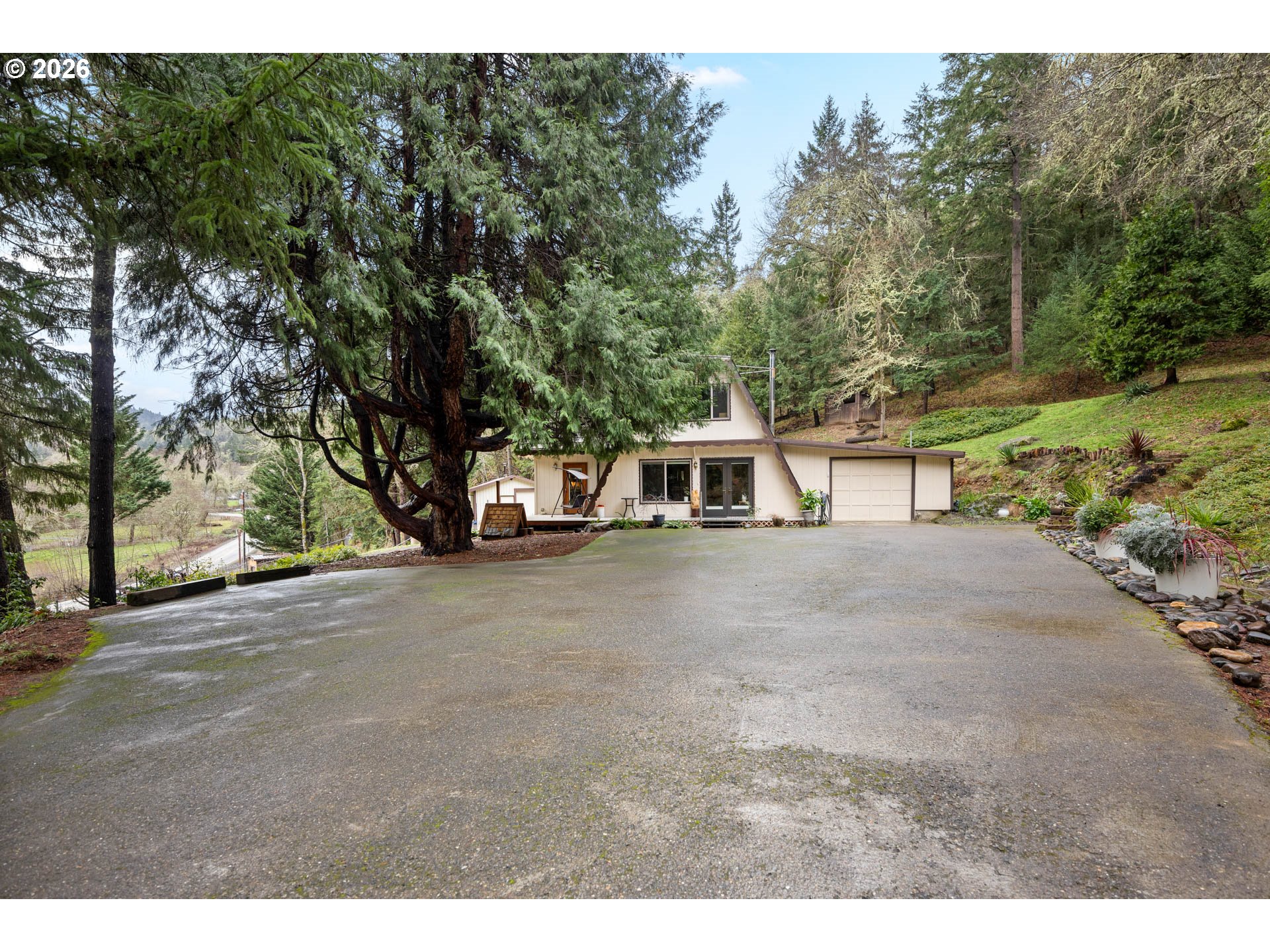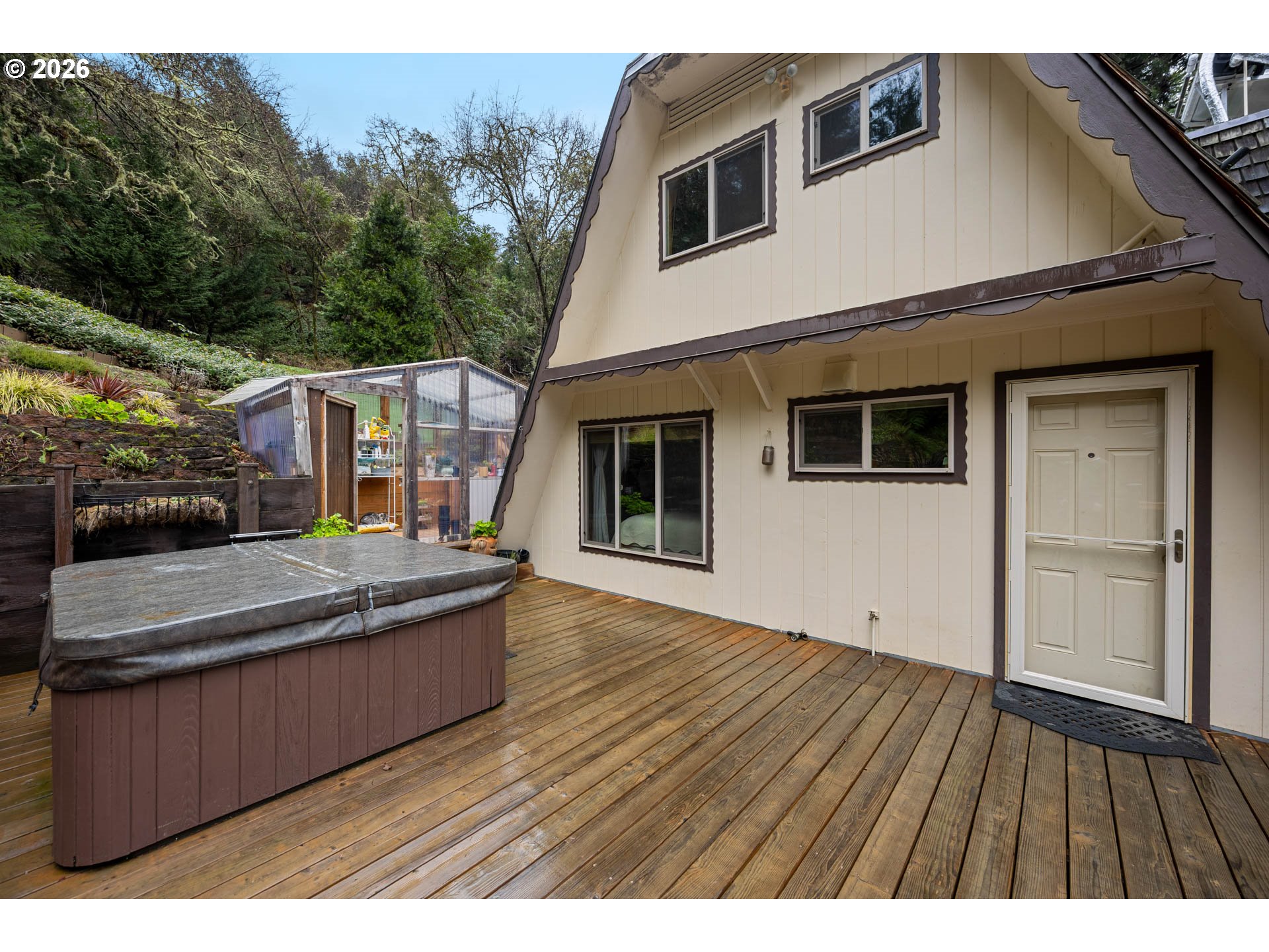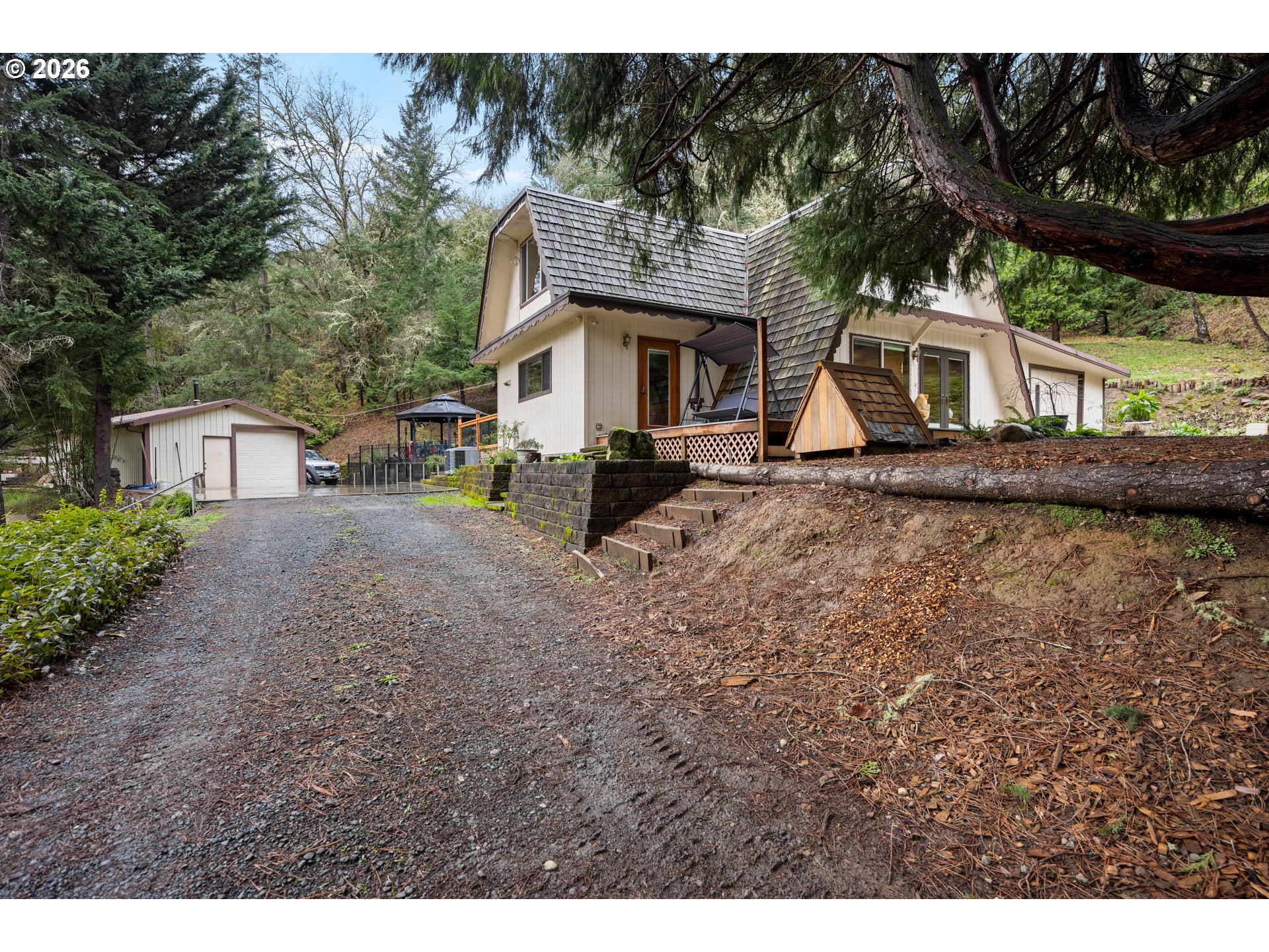 (503) 336-1515Tucked away on a private 4.6-acre setting, this charming A-frame style home offers the perfect blend of rustic character and modern updates. Step inside to discover oak hardwood floors and vaulted ceilings that create a warm, open feel throughout the 1,913 sq ft, two-story layout. The main level features a comfortable bedroom and convenient powder room, ideal for guests or main-level living. The generous kitchen is designed for both everyday living and entertaining, complete with granite countertops, updated cabinetry, stainless steel appliances, and a prep sink, all flowing seamlessly into the main living space. Upstairs, you'll find two additional bedrooms, including a spacious primary suite. The primary bath has been thoughtfully updated with new flooring, a walk-in shower, a classic clawfoot bathtub, and a double sink vanity, creating a relaxing retreat. Step outside to enjoy the home's exceptional outdoor amenities. A new Trex deck extends the living space, while a Douglas fir back deck hosts a freestanding hot tub, perfect for unwinding in a peaceful, natural setting. The property also features a gazebo, water feature, and beautifully maintained landscaping. For hobbyists and homesteaders alike, there is a large workshop, greenhouse, chicken coop, established garden area, and mature fruiting plants including plum and fig trees and grape vines. This private acreage offers endless opportunities to enjoy nature, privacy, and a truly unique lifestyle. Call today to schedule a private tour!