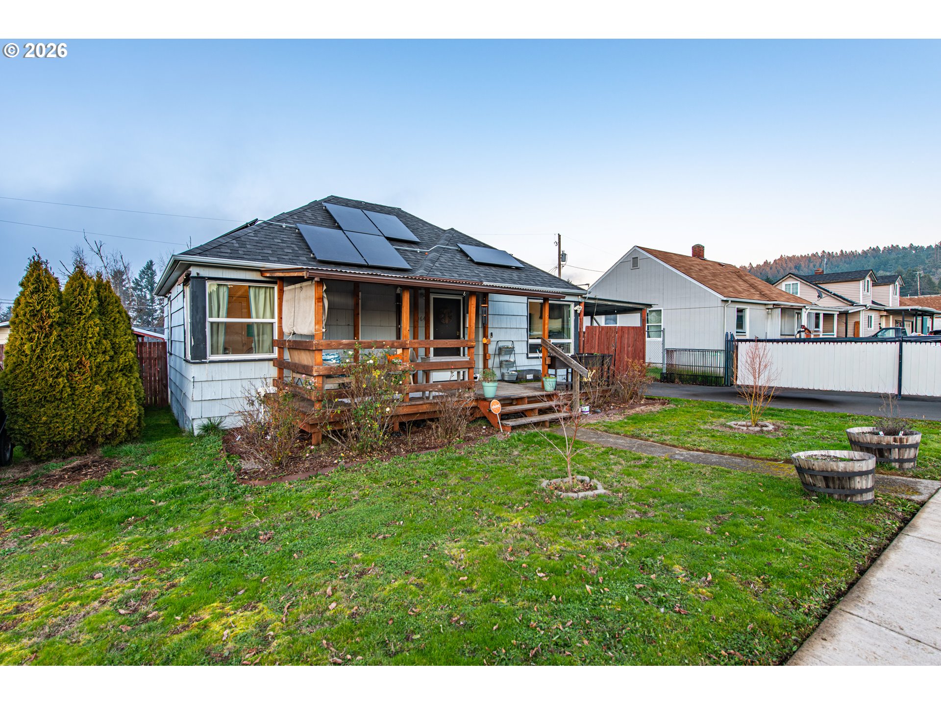 (503) 336-1515Updated bungalow in a desirable Cottage Grove neighborhood! This 872 sq ft, 2-bedroom, 1-bath home features high ceilings, new vinyl windows, and luxury vinyl flooring throughout. The remodeled kitchen offers shaker cabinets, quartz countertops, long eat bar and stainless appliances, including a glass-top range, double wall oven, and refrigerator. The fully updated bath includes a new shower and extra storage. A 240 sq ft detached flex room with laundry adds versatile space. Enjoy a 3-year-old ductless heat pump with three head units, new solar system with near-zero electric bills, generator plug-in, gated covered tandem carport for two cars, gated RV parking, tool/storage shed, and garden area. Fantastic location with easy access to I-5, shopping, parks, schools, and groceries.