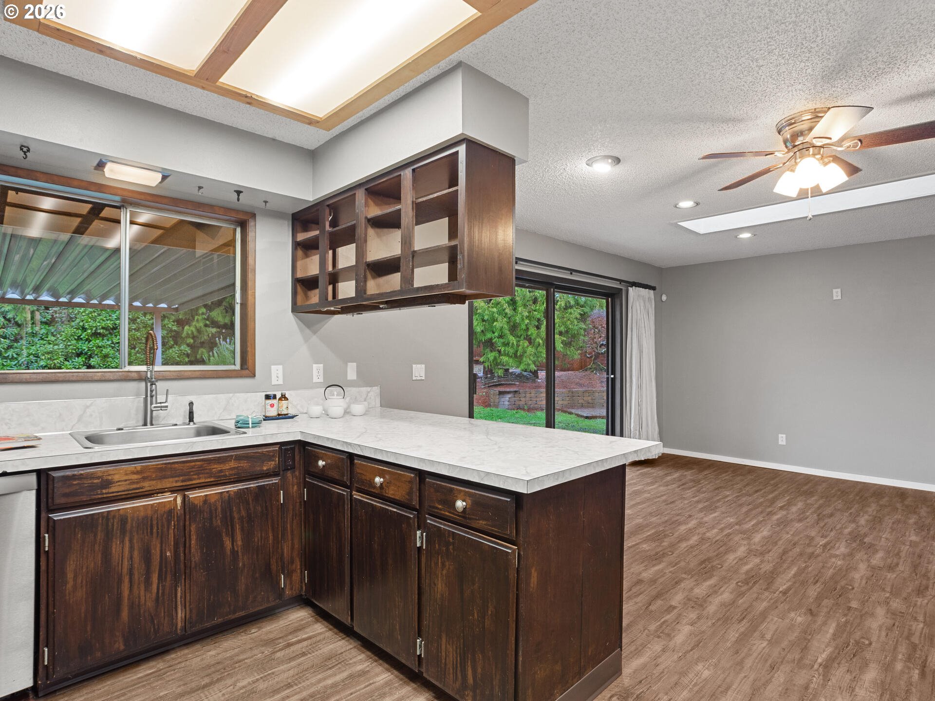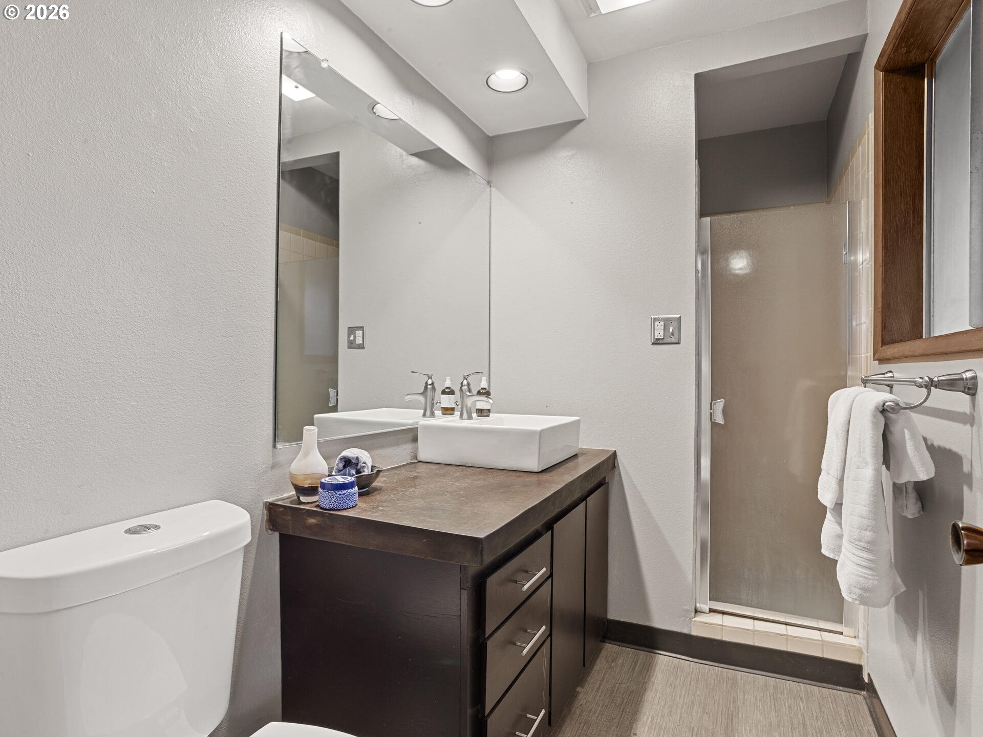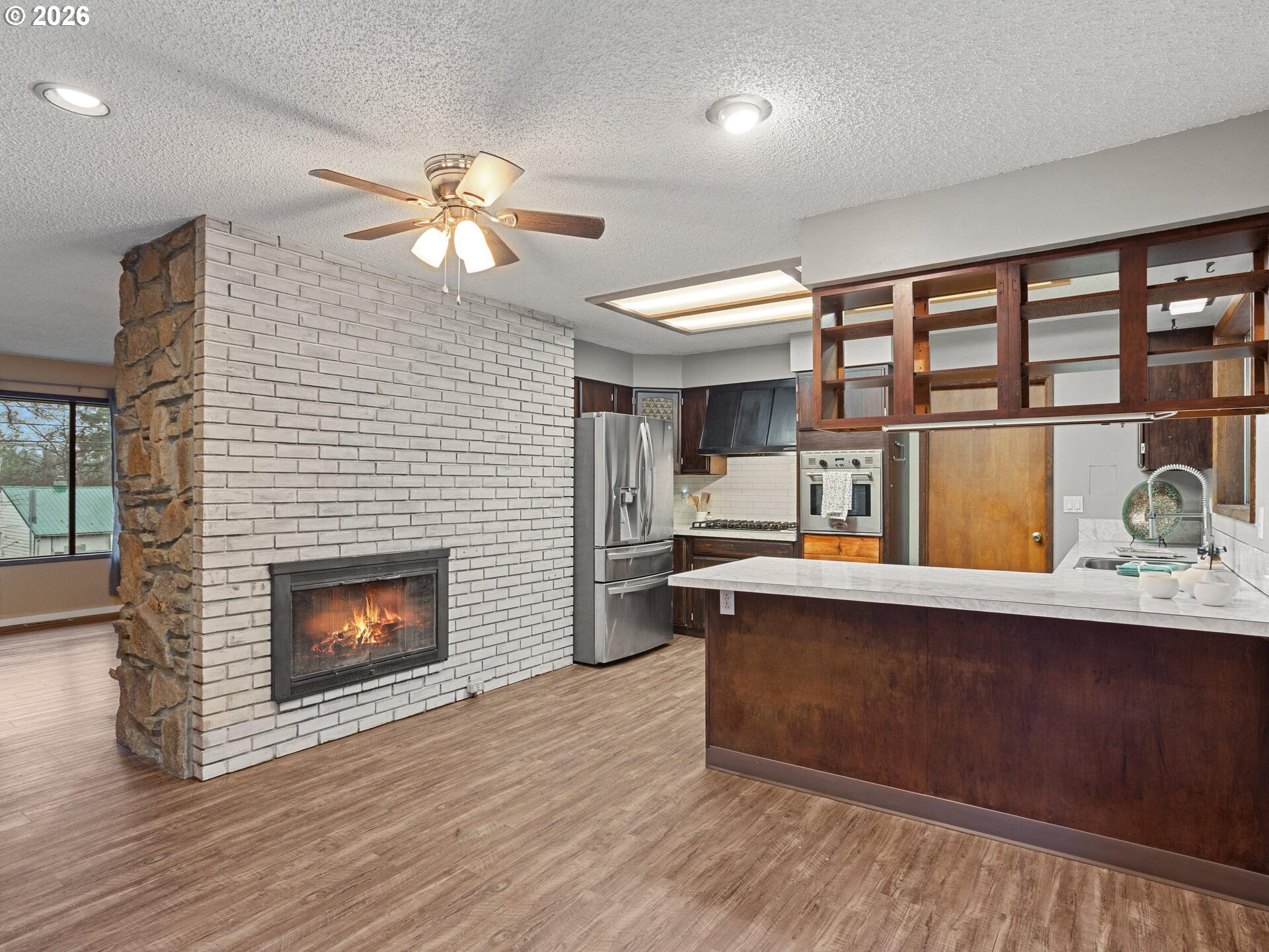 (503) 336-1515Mid-Century Modern Ranch Dream in Excellent Vermont Hills Location! Enter the hand scraped wood entry through oversized double doors, into this tastefully updated home, with thoughtful consideration to character and charm of mid-century living. Hand crafted wood paneled entry cove bench with area for shoe and coat storage, vinyl plank wood like floors throughout. Open living room with stately double sided brick fireplace, complete with large picture windows, overlooks the tree lined view of SW Portland. Spacious kitchen with plenty of storage and stainless steel appliances. Dining area with double doors leading to terraced backyard, garden beds, flat seating or possible firepit area, and hot tub pad with hookup. 3 full bedrooms, complete with primary suite and full updated bath with poured concrete countertops, custom overmount sink, and designer mirror and lighting. Patio door in primary leading to spacious and private backyard setting, with concrete pad, perfect for patio seating or a hot tub. Built-in shelving and desk in second bedroom. Oversized two car garage with additional workspace for hobbies and toys. Garage stairs lead down to finished storage area, perfect for hobbies, play, storage, or bring your imagination. Pool table included. New 25-year composition roof to be installed and included prior to closing. Open house Sunday, 01/11, from 11am - 1pm. [Home Energy Score = 5. HES Report at https://rpt.greenbuildingregistry.com/hes/OR10243343]