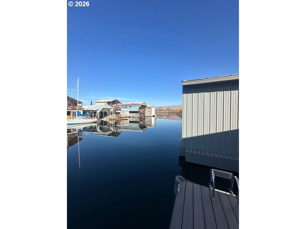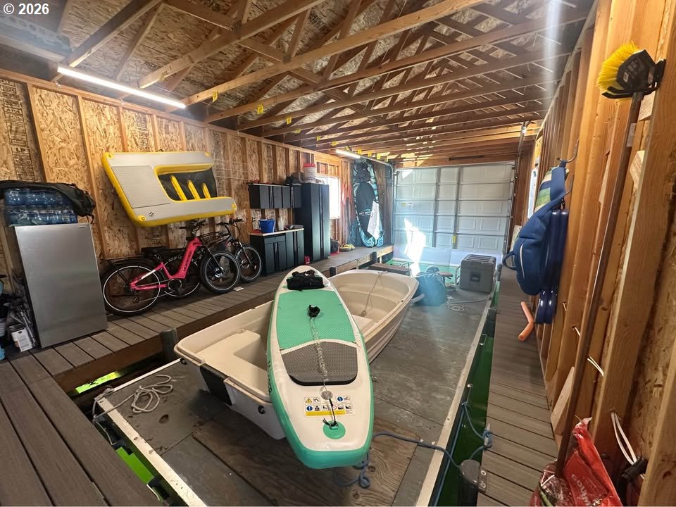 (503) 336-1515Brand-new, large boathouse located at The Dalles Marina – Space B-3. Built in 2025 with log construction and durable 2×6 exterior walls, this boathouse offers 9-foot ceilings and a total of 1952 sq ft of well-designed space. The layout includes 2 bedrooms and 1 spacious bathroom, a dedicated laundry room, and a modern kitchen with a large bar, stainless steel appliances, and under-cabinet and toe-kick lighting. The living area features a built-in electric fireplace and mini-split systems for efficient heating and cooling year-round. Enjoy outdoor living on the large deck measuring approximately 15’ × 31’. The boat well measures approximately 10’6” × 29’6” and includes a side-mount garage door opener, along with a generously sized garage/storage area. Additional features include propane on-demand hot water, a propane stove/oven, and all brand-new furniture, negotiable with purchase. This property may not be used as a full-time residence and is subject to approval by The Dalles Marina LLC.