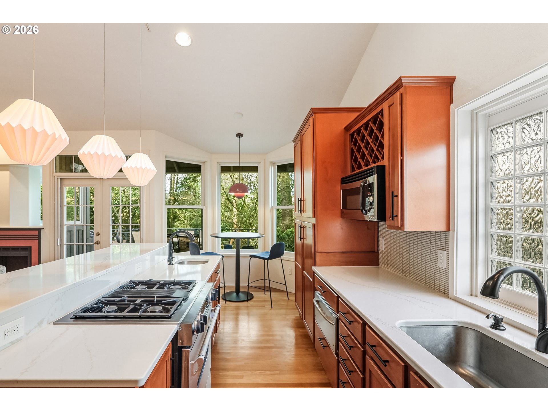 (503) 336-1515Expansive single-level home offering high ceilings, abundant natural light, and a private green space backdrop located on over a quarter-acre. Exceptionally maintained and thoughtfully updated, this home boasts original hardwood floors and skylights that bring light into every corner of the home. The chef's kitchen is designed for entertaining with new quartz countertops and tile backsplash (2021), an expansive island with integrated storage and prep sink, food-warming cabinet, premium stainless steel appliances including JennAir gas range, built-in microwave, and a cozy breakfast nook. Recent improvements include new Andersen windows and skylights, custom up-down window treatments, updated lighting fixtures, a new solar tube, and newer interior paint. The primary suite features vaulted ceilings and a spacious ensuite with a large walk-in closet, walk-in shower, jetted soaking tub, and double sinks with granite countertops. Two additional bedrooms offer flexibility, with one ideal for a home office or guest space. The living room showcases hardwood floors, a gas fireplace, high ceilings with a skylight, and French doors that open to the backyard. Outside, a multi-level deck and custom paver patio create an exceptionally private setting surrounded by mature trees and fully fenced grounds, backing directly to green space. All of this is just minutes from Bridgeport Village, parks, and major freeways, offering convenience without sacrificing privacy.